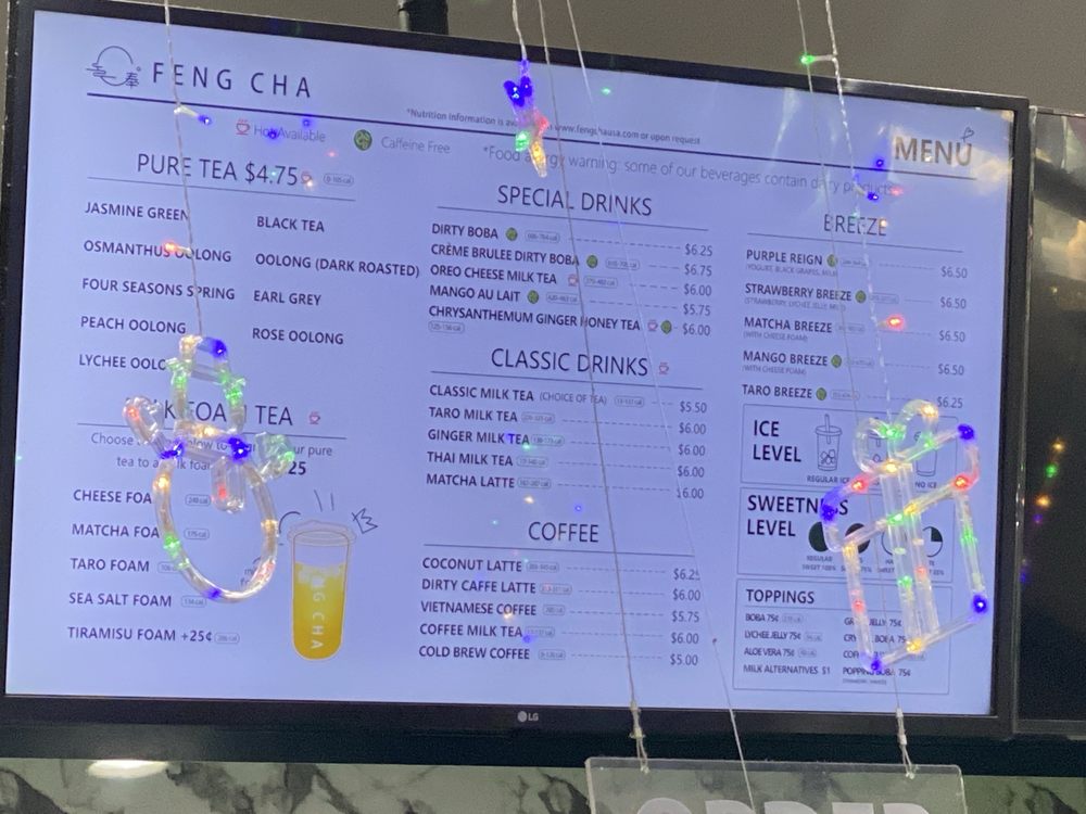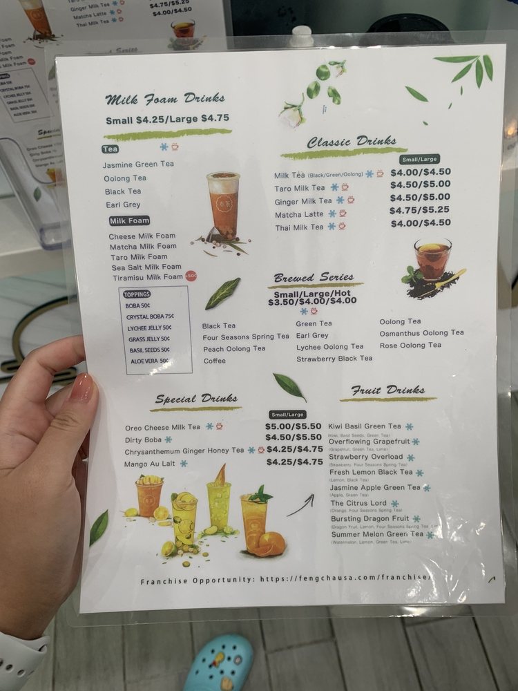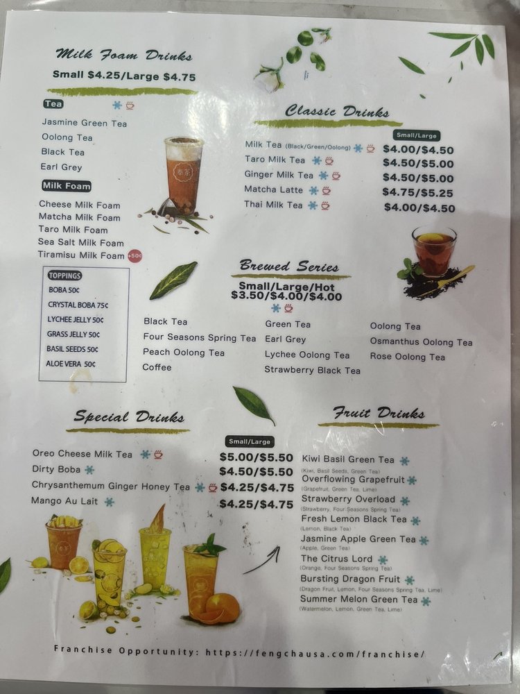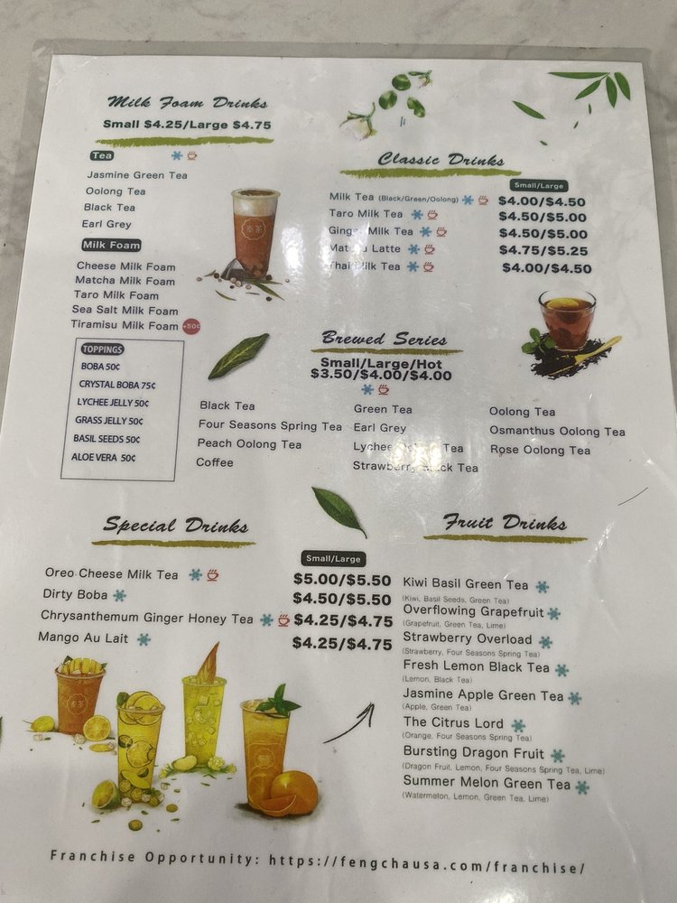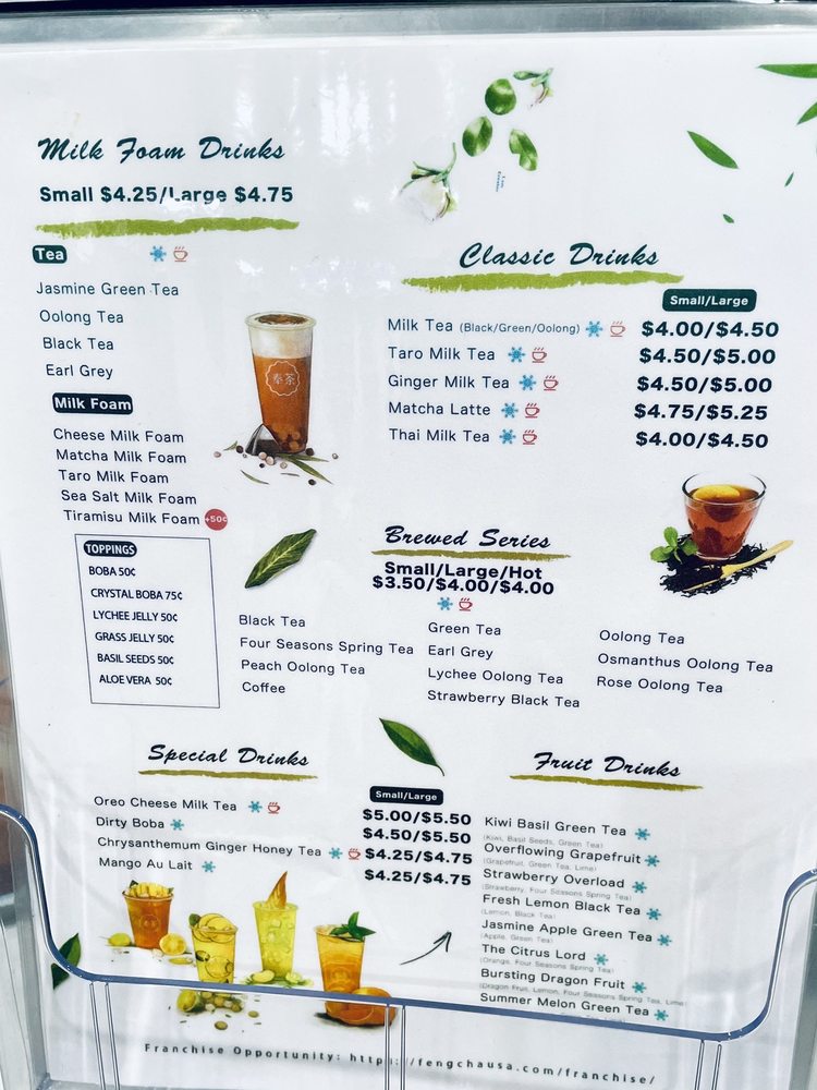 Feng Cha Teahouse, located at 891 Baker St Ste A18 in Costa Mesa, CA, offers a delightful array of desserts, bubble tea, coffee, and tea. The menu boasts a variety of options, including vegan choices and customizable sweetness and ice levels. Customers rave about favorites like the Sea Salt Pearl and the Dirty Boba, featuring brown sugar milk tea with cheese foam. The ambiance is charming with nature-inspired decor, and the service is top-notch. With friendly staff and quick service, Feng Cha is a solid choice for boba enthusiasts. Don't miss out on their signature drinks like the Matcha Breeze or Oreo Cheese Milk Tea. Whether you're stopping by for a sweet treat or a refreshing drink, Feng Cha Teahouse promises a delightful experience for all.